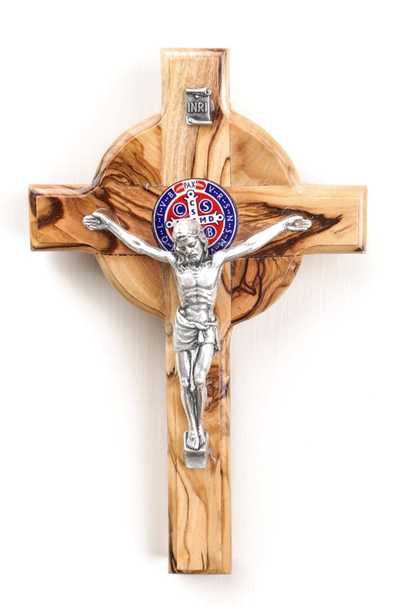Olive Wood Jerusalem Cross_ Silver Oxide Crucifix on Stand